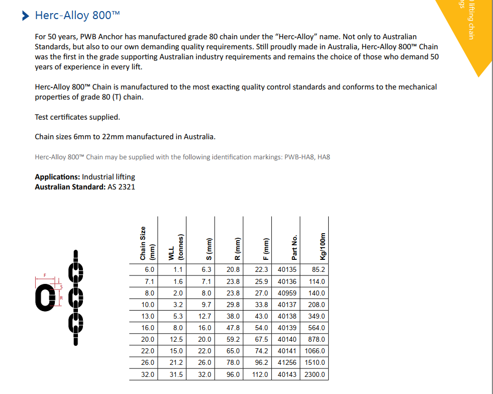 | Part No. | Chain size (mm) | WLL (ton) | S (mm) | R (mm) | F(mm) | Kg/100m |