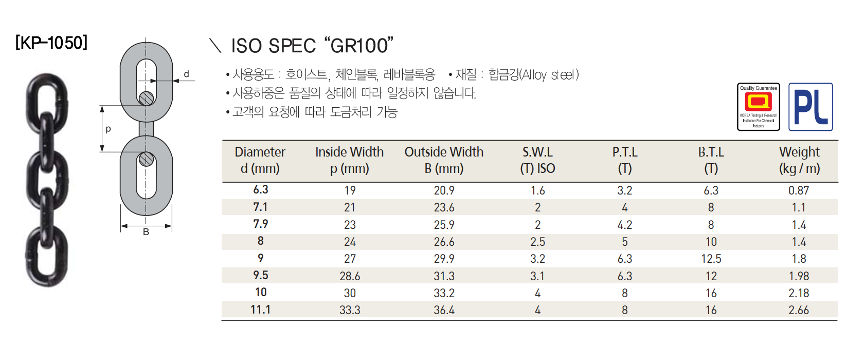 | Diameter d(mm) | Inside width p(mm) | Inside width (mm) | Outside width B (mm) | S.W.L (T) ISO | P.L.T (T) | B.L.T (T) | Weight (kg/m) |